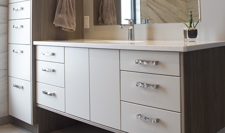Your bathroom's wear and tear is largely down to choosing materials and finishes that withstand excessive heat, water, and moisture. In general, cabinets are made of plywood, chipboard or medium density fiberboard (MDF) boxes combined with drawer sides and solid wood doors.