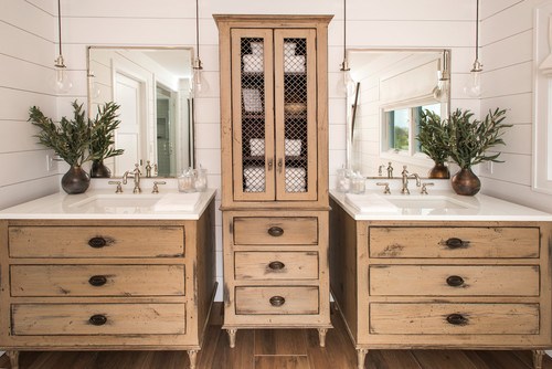 This is the type of cabinet that offers a classic style that is deliberately weathered, luxurious and unique. For the look of the cabinet accentuate the styling along with brushed metal counter accessories, crystal lighting and a large mirror. Remarkably, thanks to special decorating techniques and the addition of just the right amount of rust to make these cabinets are not limited to cottage, shabby chic, farmhouse and eclectic styles.