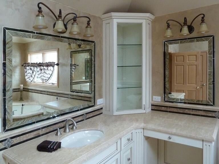 - The first is the thumb of the cabinet: often brightly colored cabinets will reflect light. This makes the bathroom space look bigger. Conversely, dark cabinets will absorb light, creating a smaller space.
